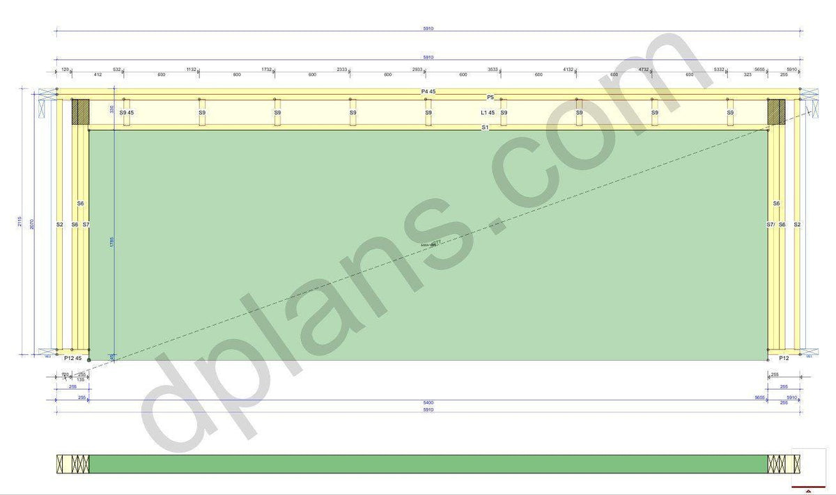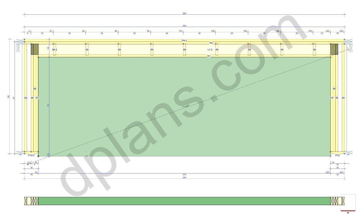 * Structural Drawings: Detailed elevations, floor plan, roof framing layout, and wall sections showing all timber members and connections