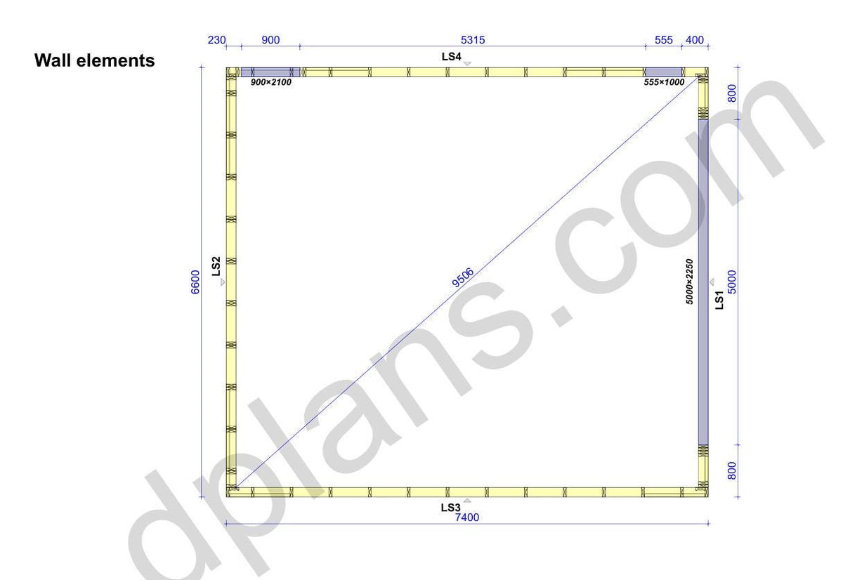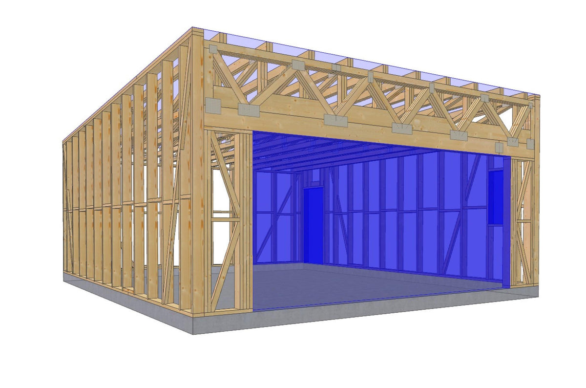 * Structural Drawings: Detailed elevations, floor plan, roof framing layout, and wall sections showing all timber members and connections