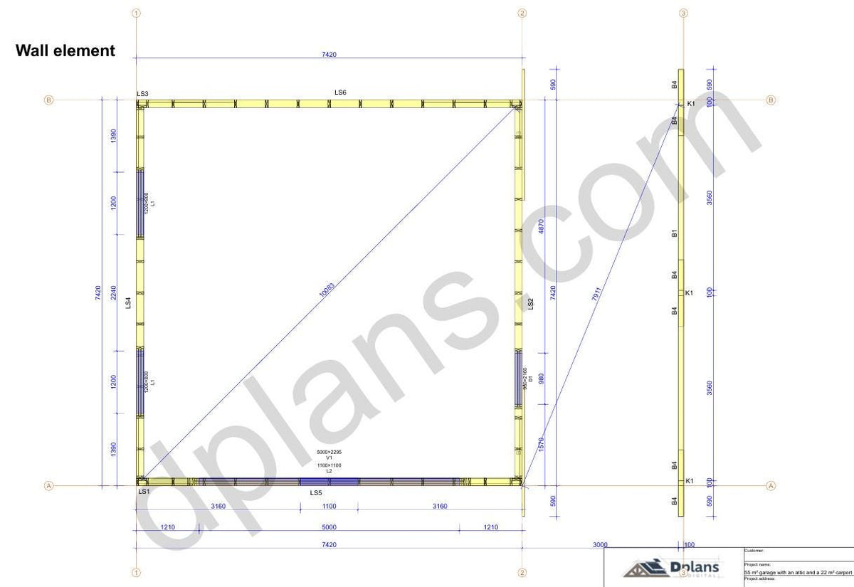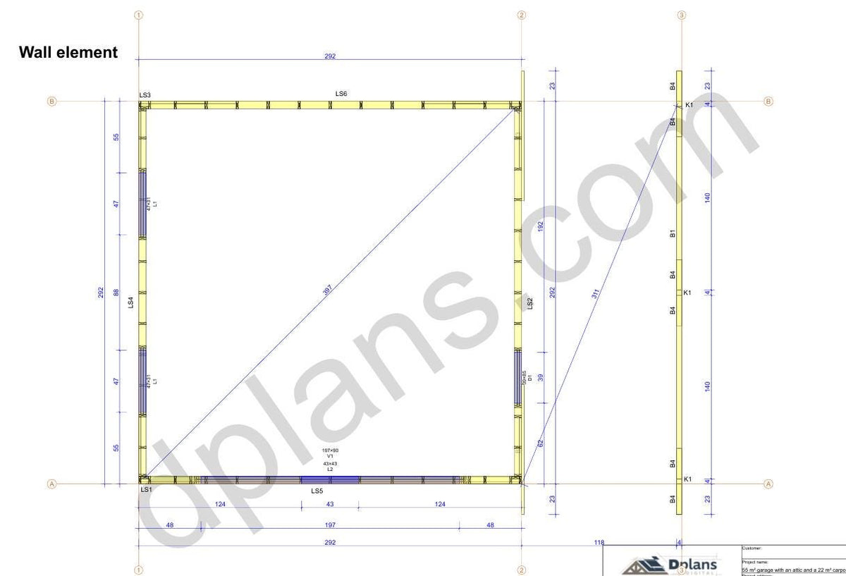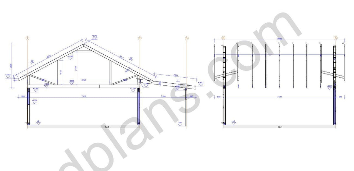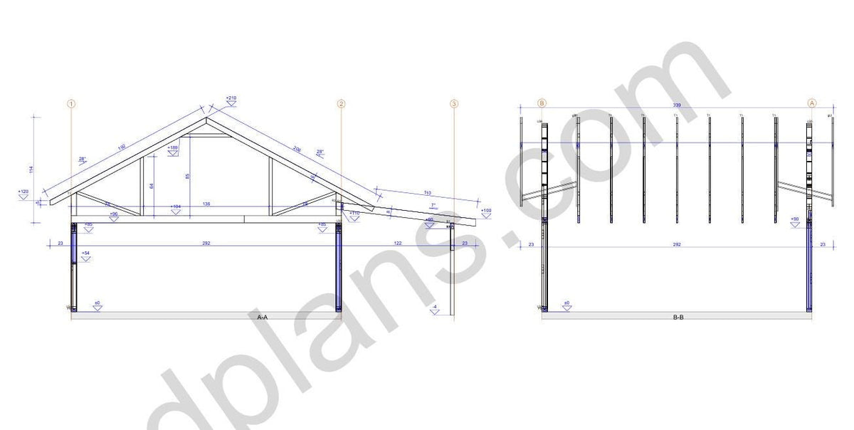 Structural Drawings: Detailed elevations, floor plan, roof framing layout, and wall sections showing all timber members and connections