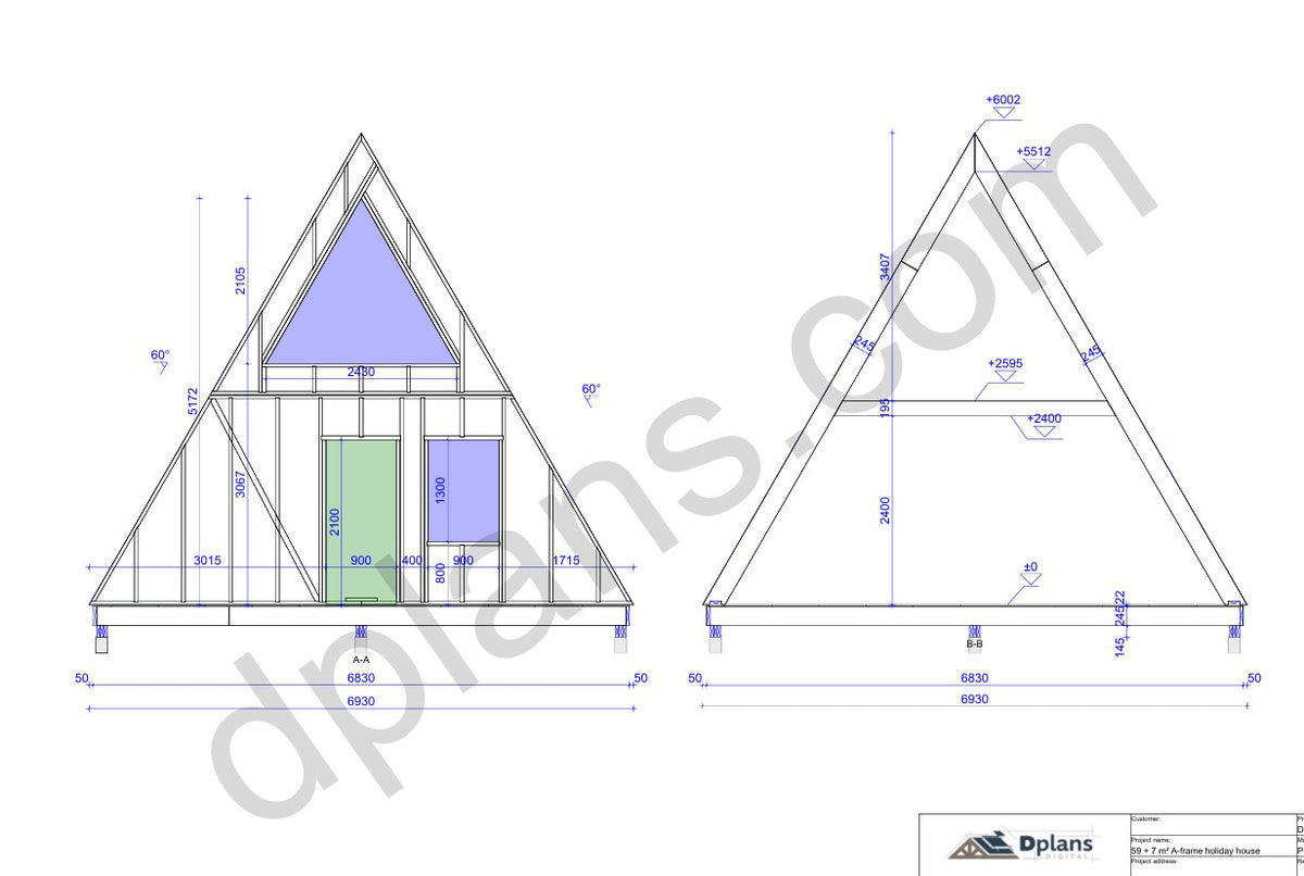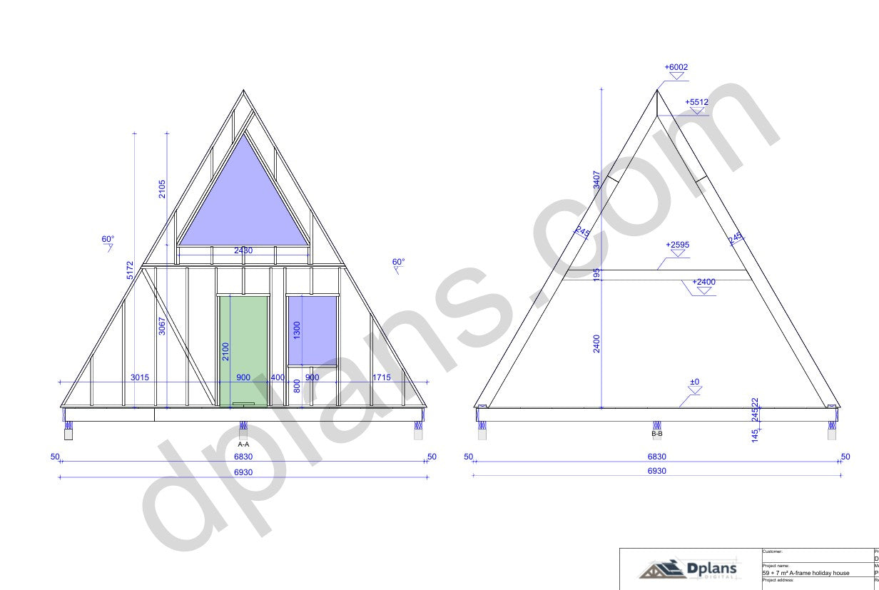 The steep-pitched A-frame roof extends to ground level, creating an efficient, weather-resistant envelope with 59m² (635 sq ft) of main floor space plus a 7m² (75 sq ft) loft area. The design maximizes interior volume while minimizing exterior surface area for excellent thermal performance. Structural members are optimized for standard dimensional lumber availability.