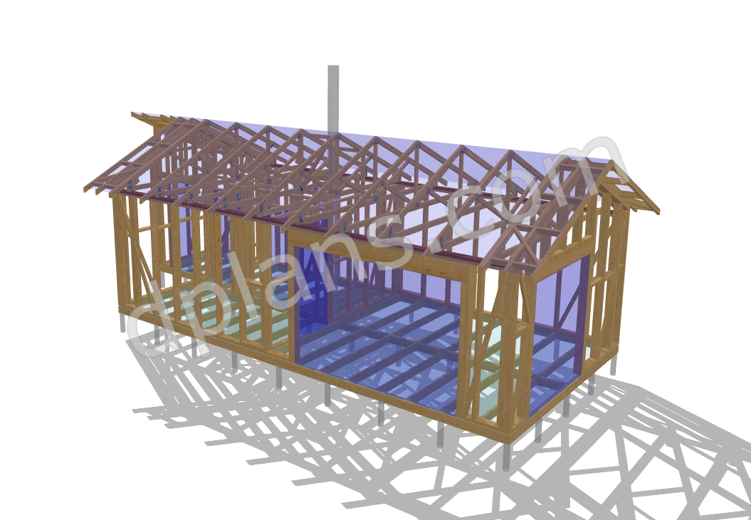 This elevated structure features a traditional gable roof design with engineered roof trusses and a covered entrance area. The 43m² (463 sq ft) interior provides flexible space for a sauna room with changing area, or can be configured as a small cabin with living space. The elevated screw/pile foundation allows for installation on various terrain types and provides excellent ventilation beneath the structure, essential for sauna buildings. The covered entrance protects from weather and adds functional outdoor space. Structural members are optimized for standard dimensional lumber availability.