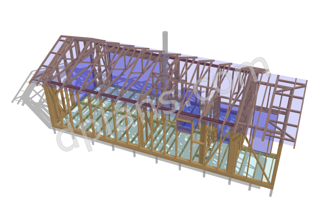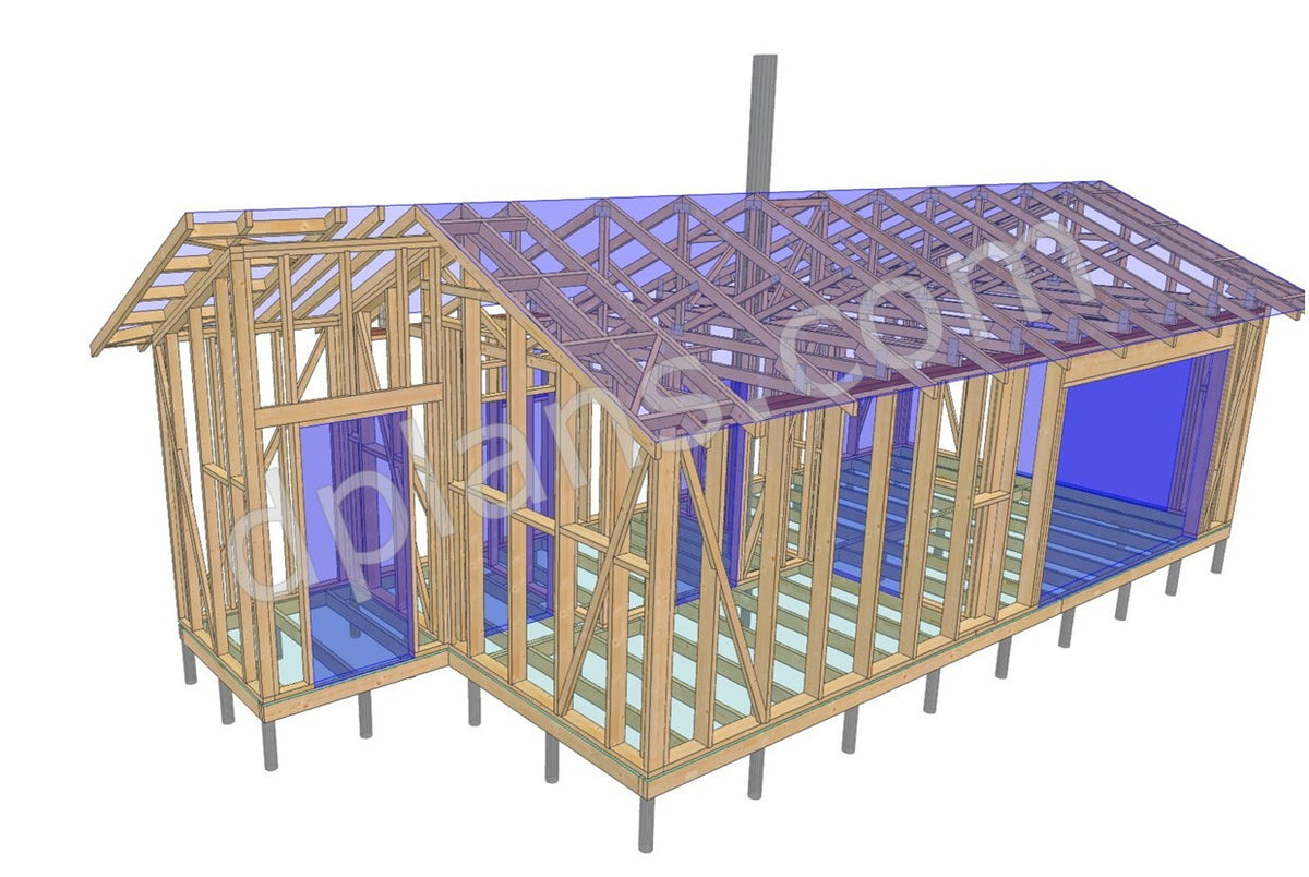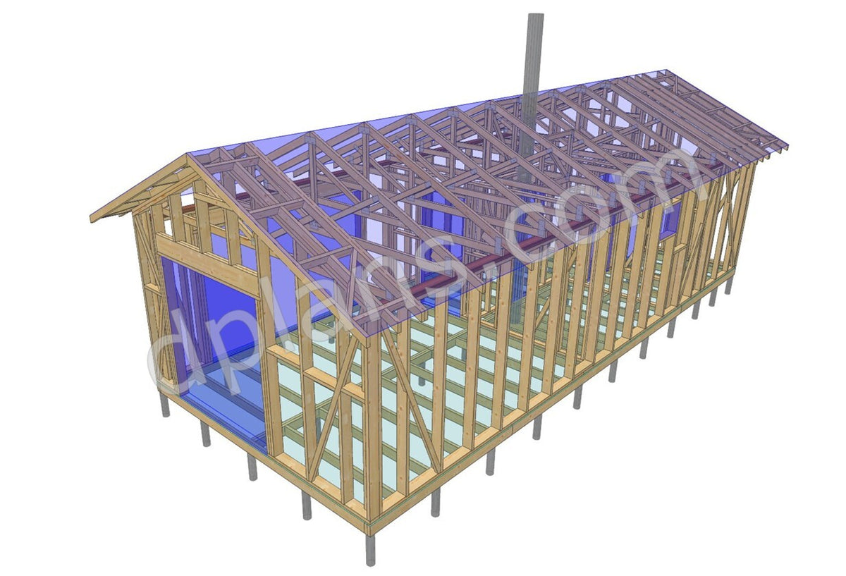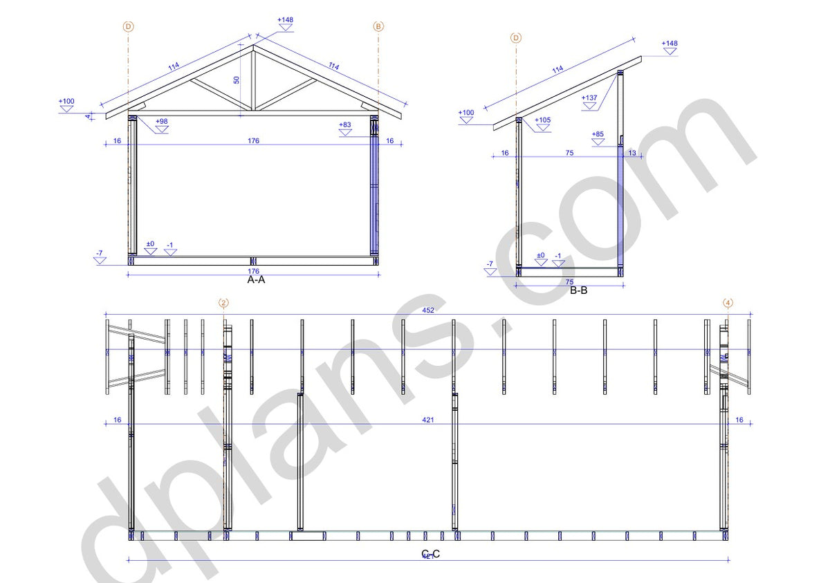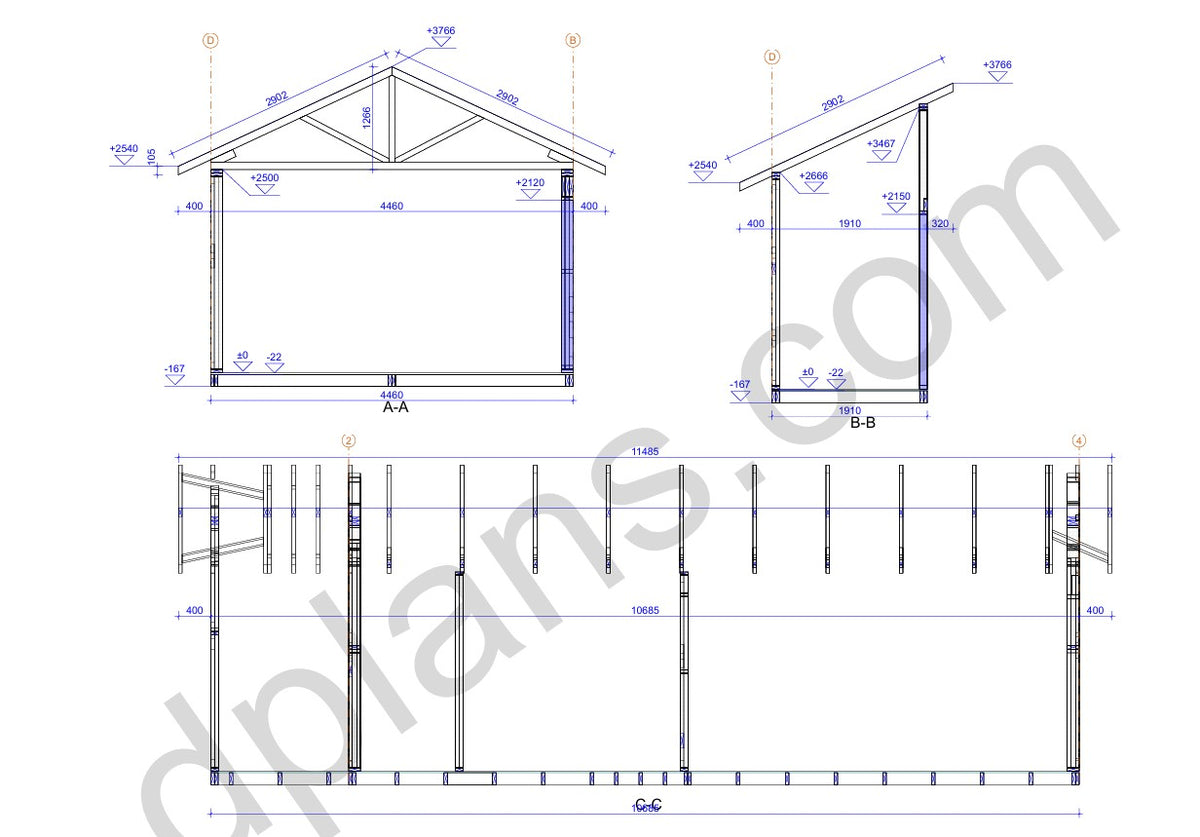 Structural Drawings: Detailed elevations, floor plan, roof framing layout, and wall sections showing all timber members and connections