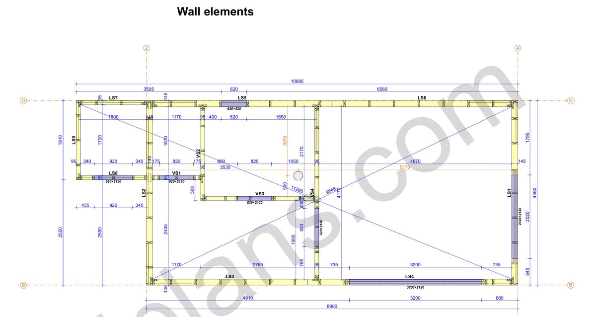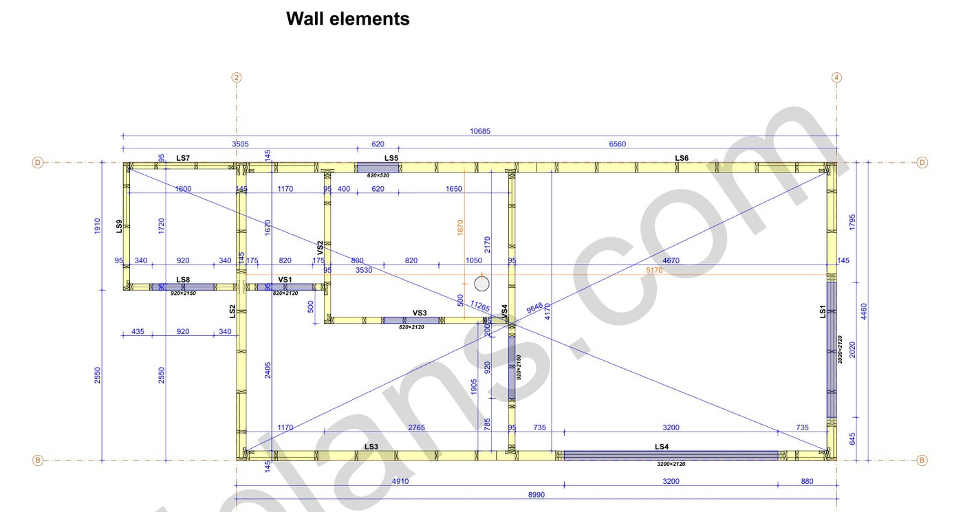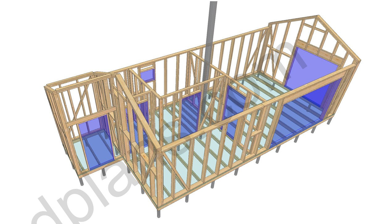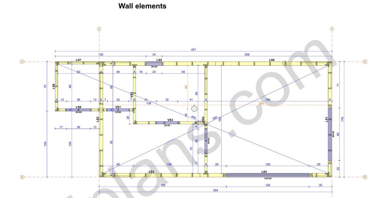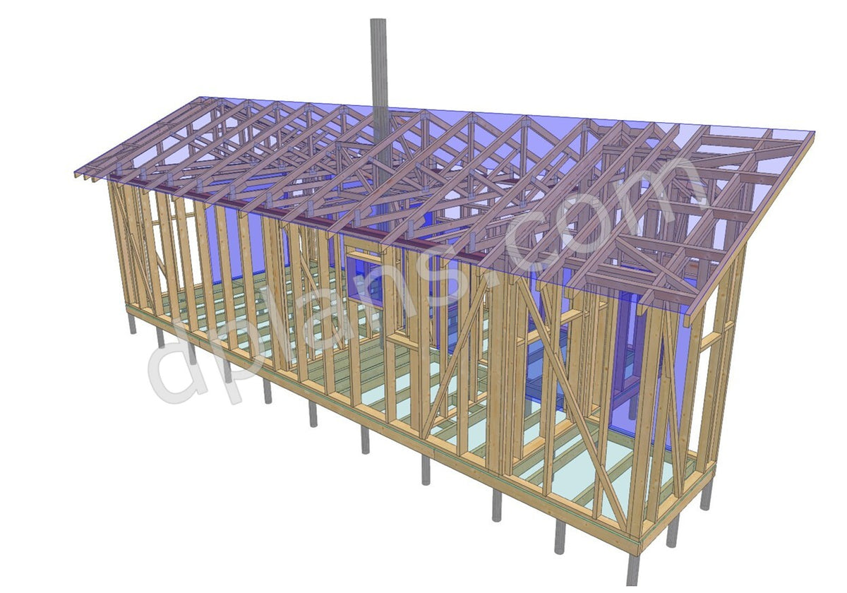 Structural Drawings: Detailed elevations, floor plan, roof framing layout, and wall sections showing all timber members and connections