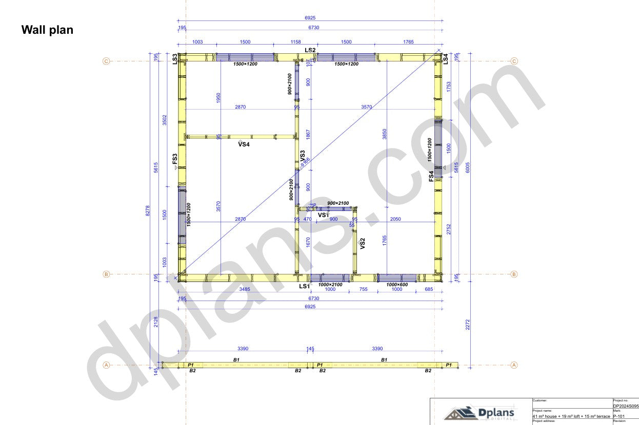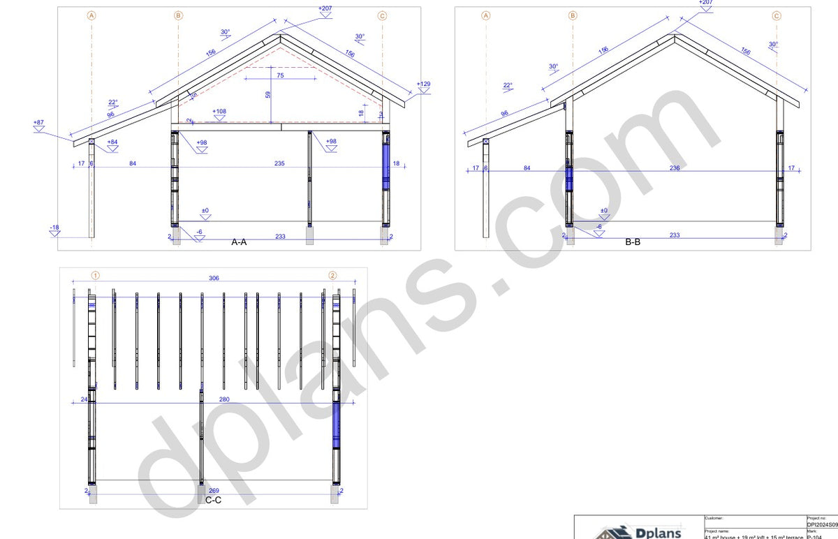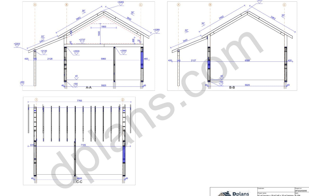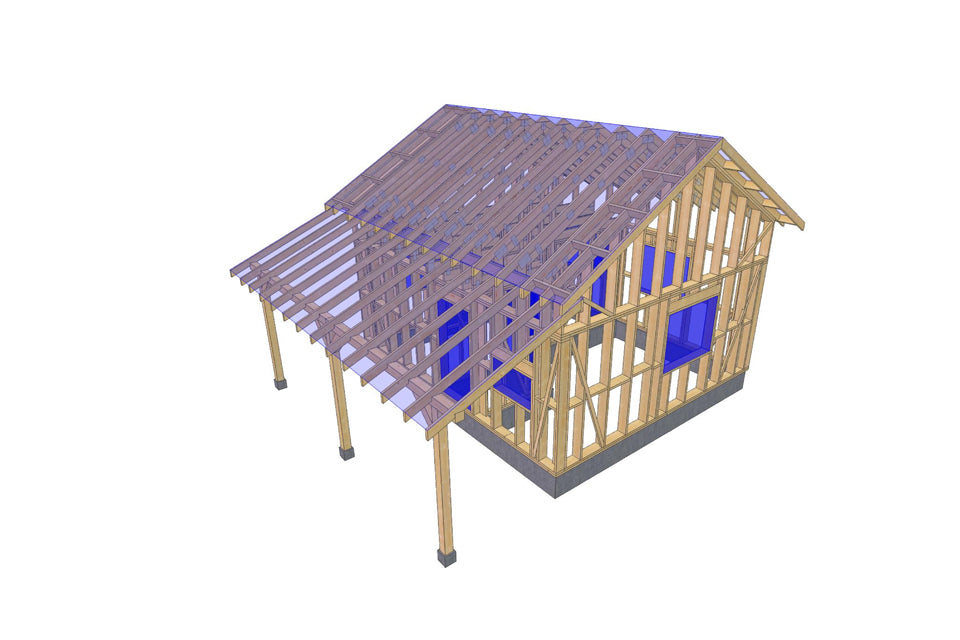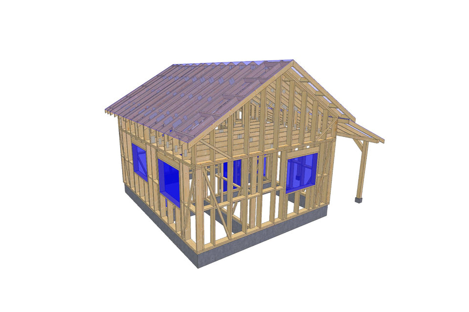 This compact house features a traditional gable roof design with a functional loft space and a generous covered terrace. The 41m² (441 sq ft) main floor provides essential living space, while the 19m² (205 sq ft) loft adds extra sleeping or storage area. The 15m² (161 sq ft) covered terrace extends your living space outdoors, perfect for relaxing or entertaining. The timber-frame construction with engineered roof trusses ensures durability and efficient use of space. Structural members are optimized for standard dimensional lumber availability.
