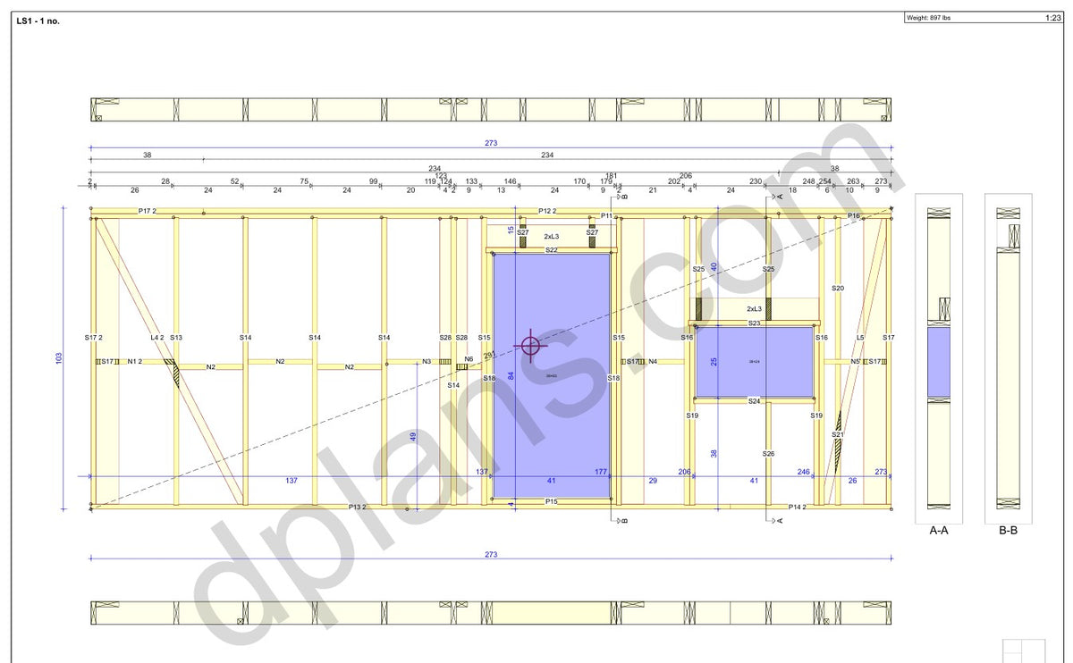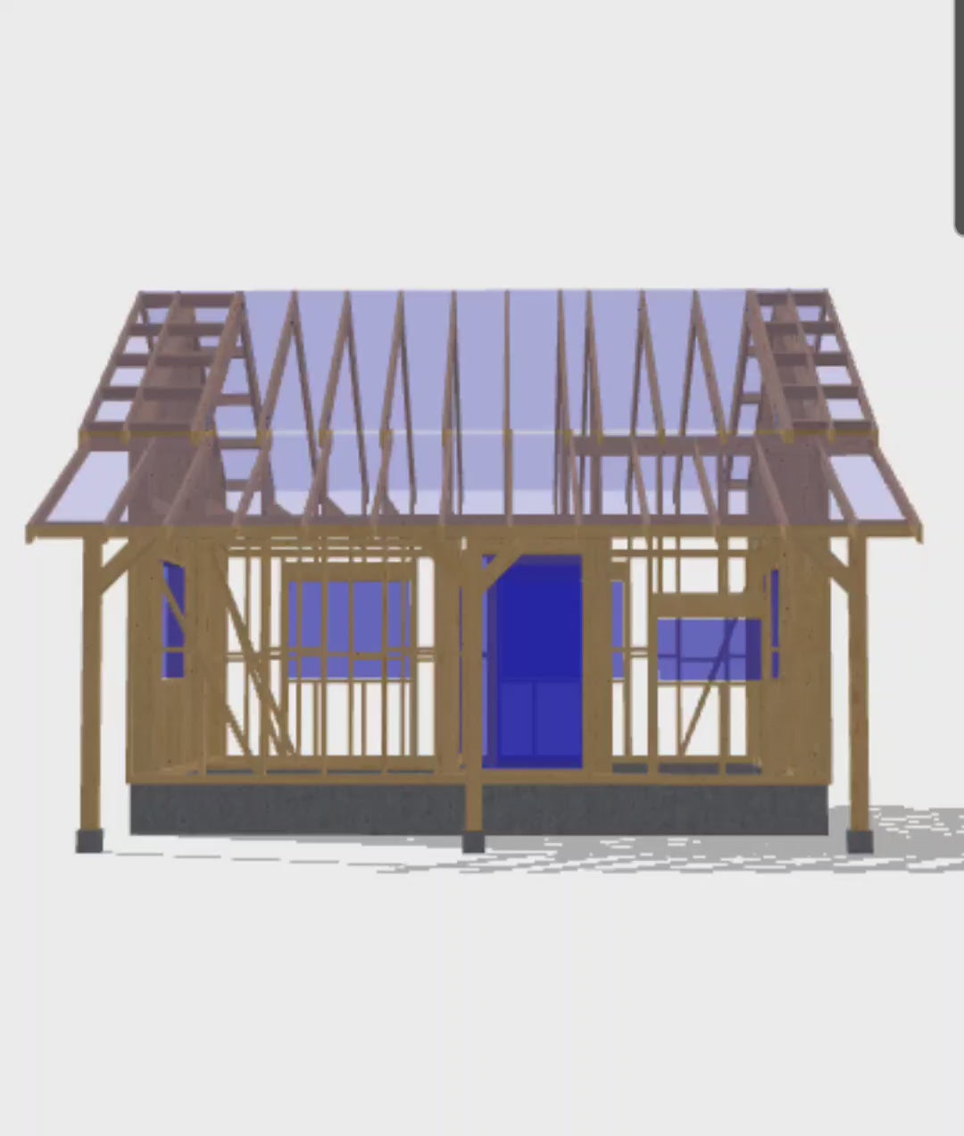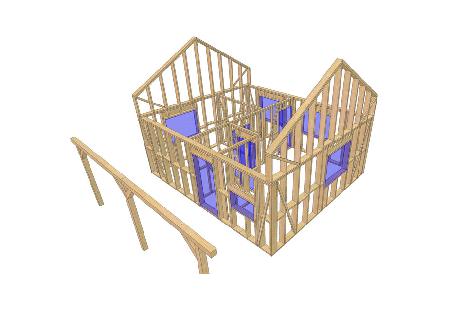 Structural Drawings: Detailed elevations, floor plan, roof framing layout, and wall sections showing all timber members and connections