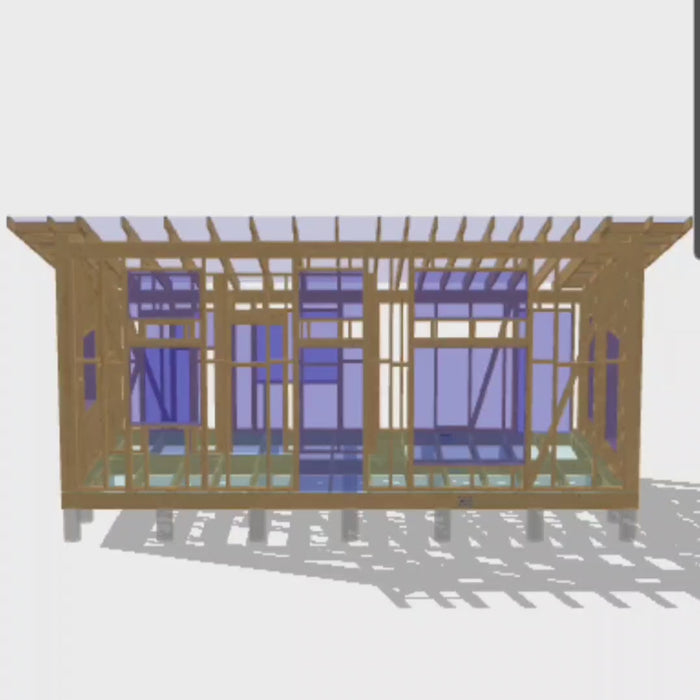 This modern cabin features a shed-style roof with extended rafter overhang for added weather protection and visual appeal. The 41m² (441 sq ft) interior provides flexible space for a home office, studio, workshop, or guest accommodation. The elevated screw pile foundation system allows for installation on uneven terrain and provides excellent ventilation beneath the structure. Large window openings maximize natural light. Structural members are optimized for standard dimensional lumber availability.